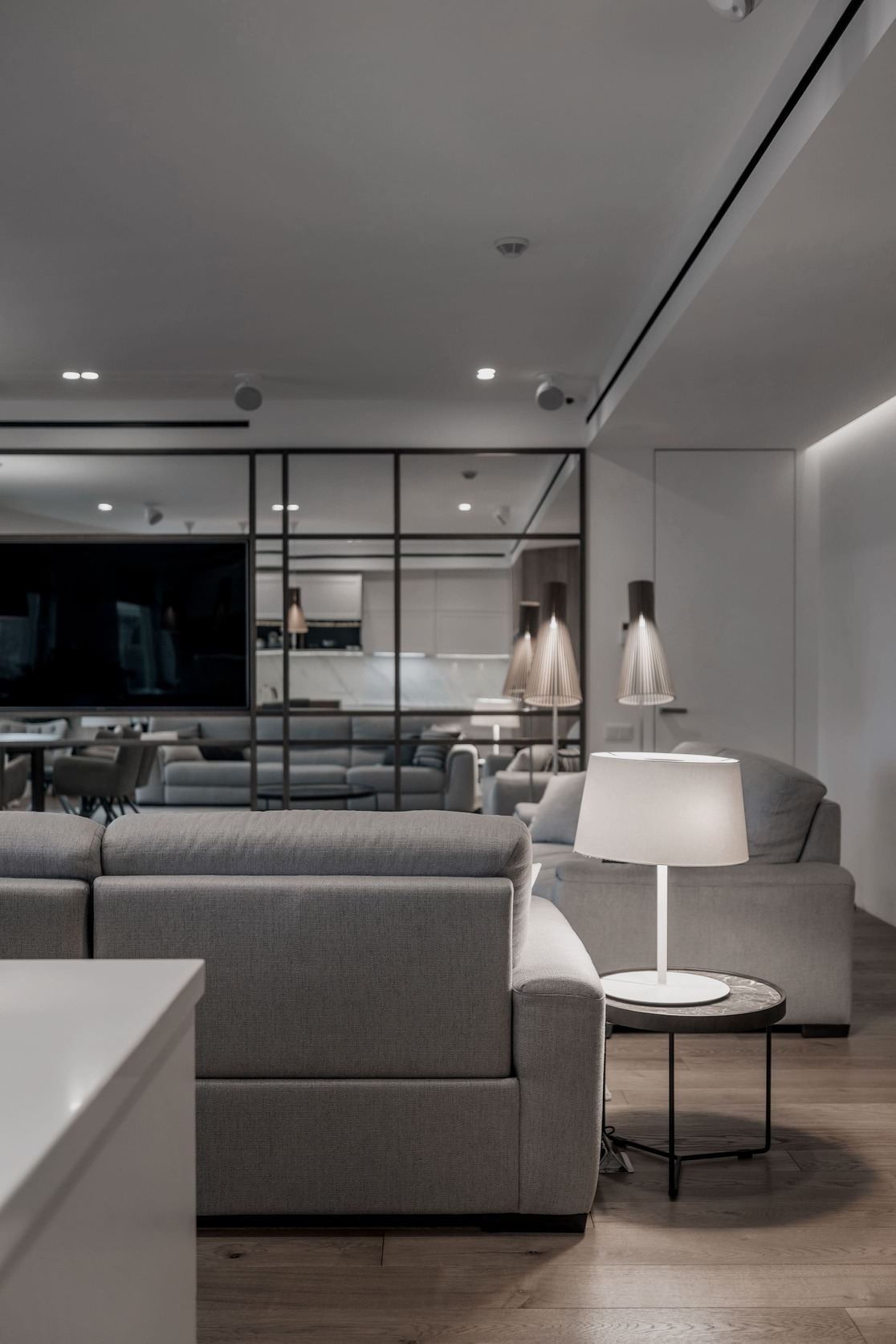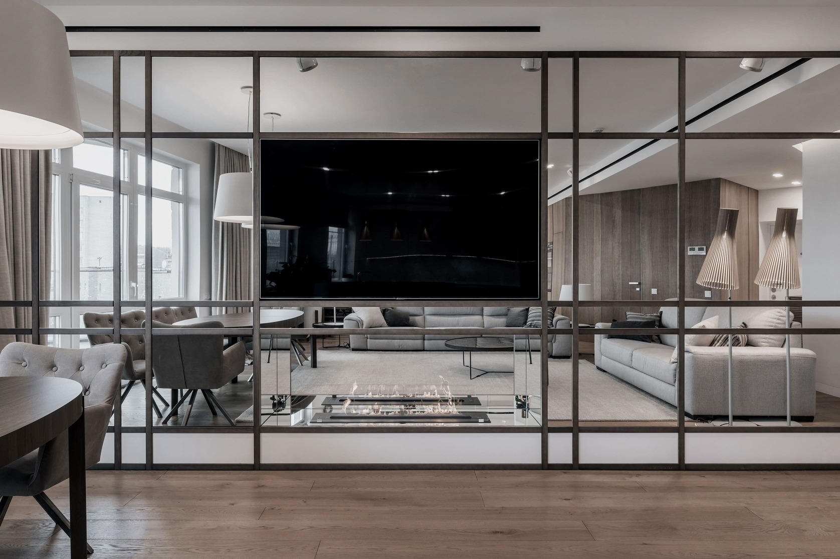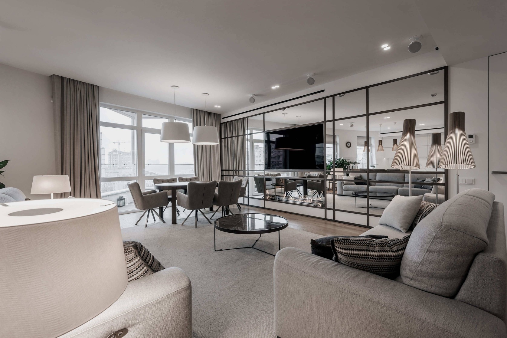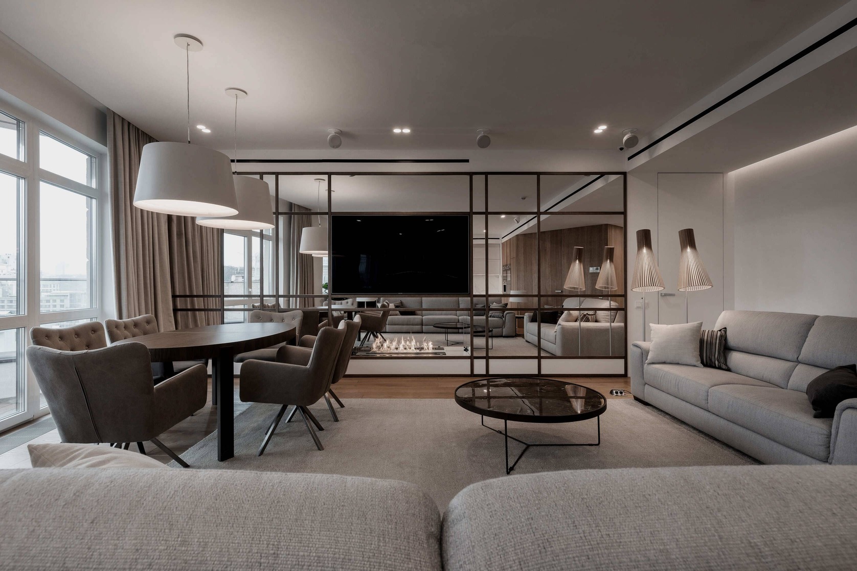Layout: | The apartment space consists of a large living room - kitchen, a bedroom with a glass wardrobe area, separated by a marble partition, and a bathtub by the window, a children's room, and several bathrooms |