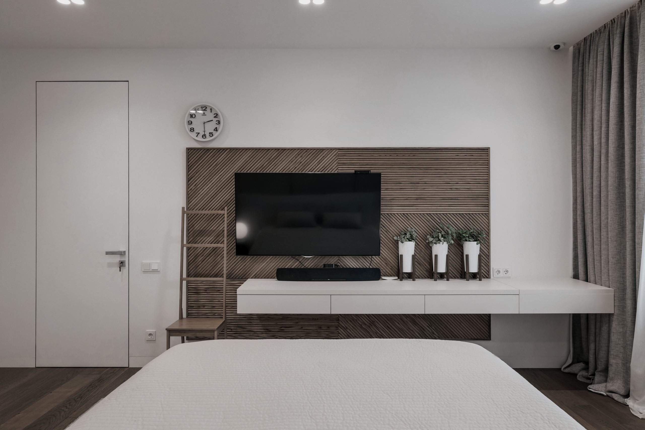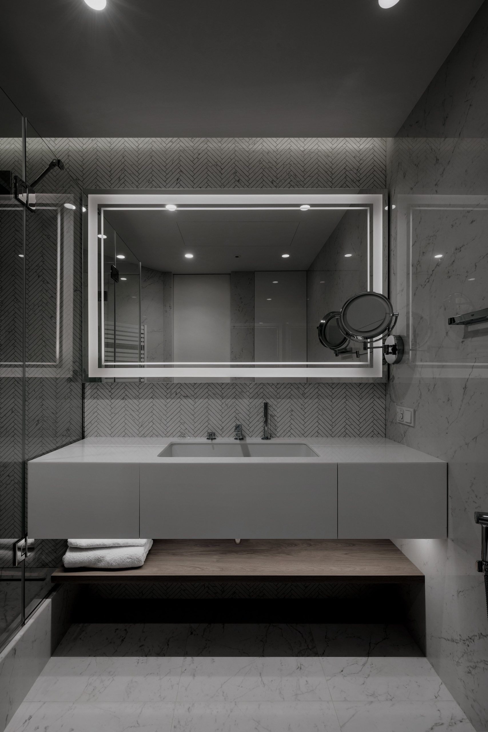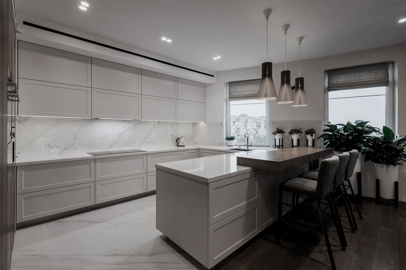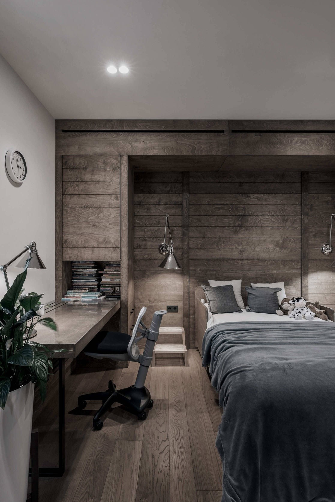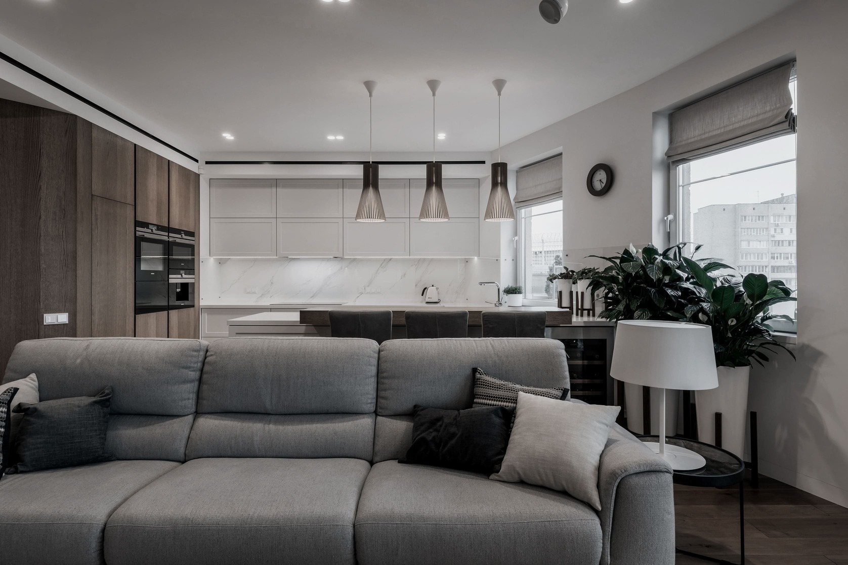 Layout: | The apartment space consists of a large living room - kitchen, a bedroom with a glass wardrobe area, separated by a marble partition, and a bathtub by the window, a children's room, and several bathrooms |